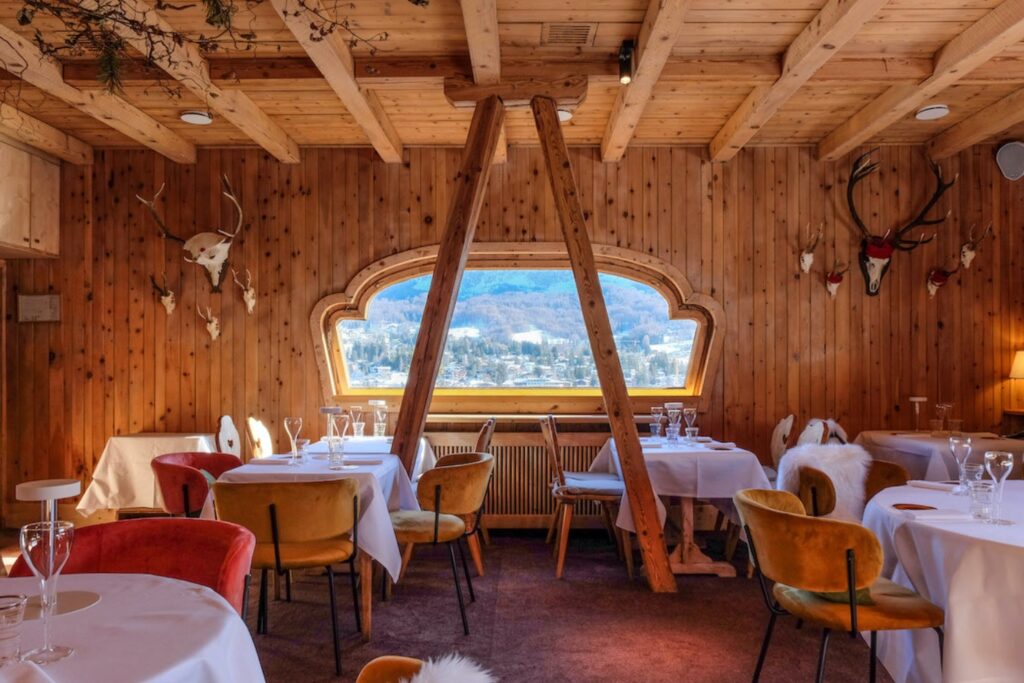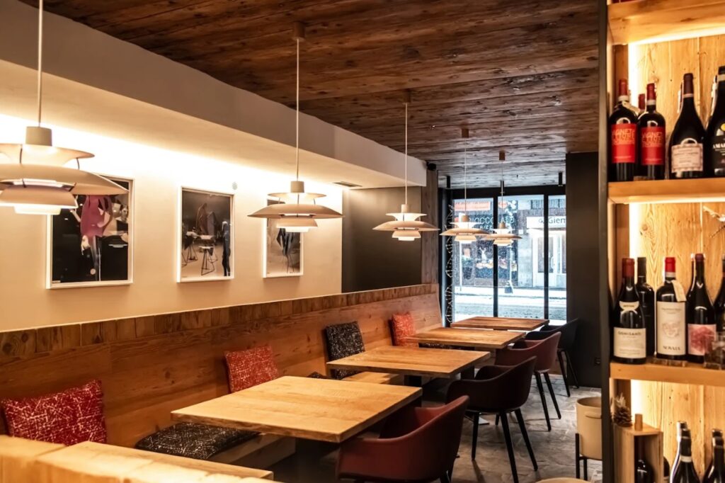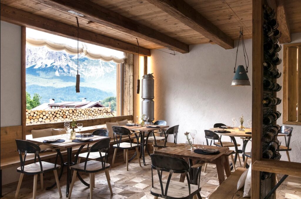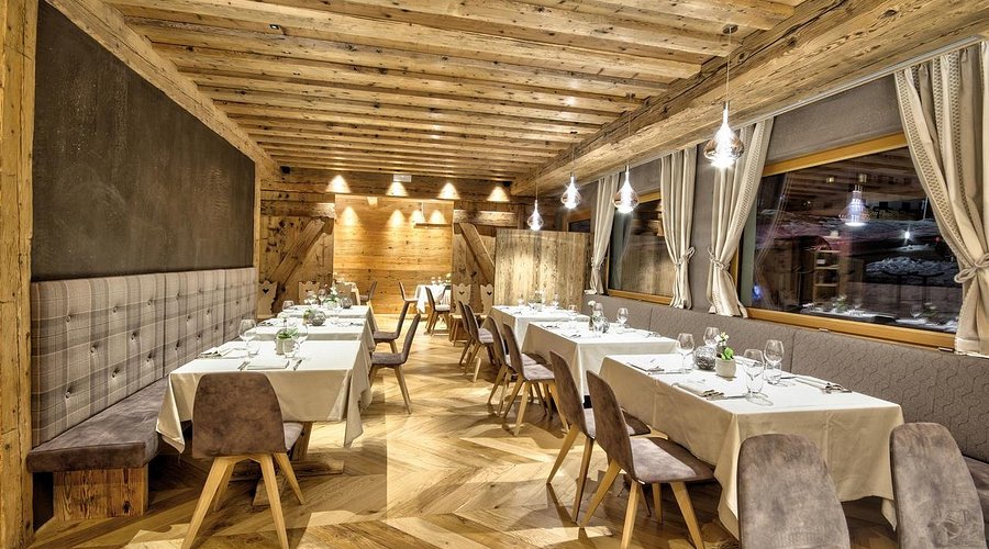 Здание бывшей горной хижины (мальги), которая была восстановлена, превратившись в уютный ресторан, где интерьер выдержан в альпийском стиле: дерево, натуральные материалы, тёплое освещение, виды на лес и горы.
