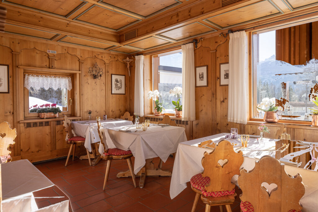 Шеф-повар Алессандро подает традиционные блюда, щедро приправляя их фантазией и любовью к своим горам. Карпаччо из оленины с яблоками, местные сыры с чатни из груш, полента с лисичками и коллекция пасты, включая спагетти карбонара с черным трюфелем и тальолини с рагу из белого оленя. Казунзей (casunziei), пряные местные равиоли со свеклой, меняют все представления о месте свеклы в итальянской кухне – оказывается, она и здесь может быть настоящей примой.