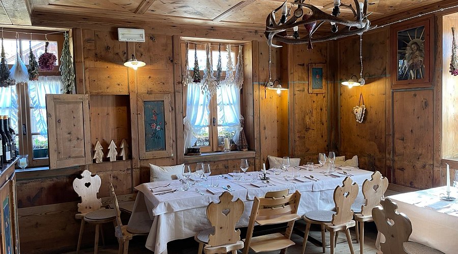 Скромное обаяние охотничьей таверны: обшитые деревом стены, стулья с резными спинками, на стенах – трофеи охотников и гравюры по теме. Терраса с видом сразу на пять вершин Доломитовых Альп. В основе простой кухни – принцип «нулевого километра»: сугубо локальные продукты, за которыми не нужно никуда ехать.