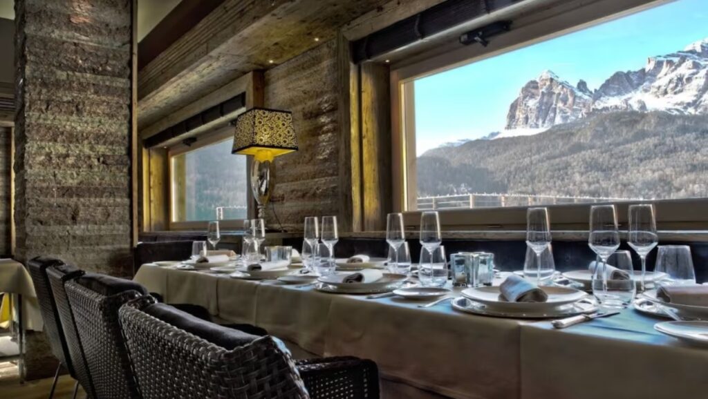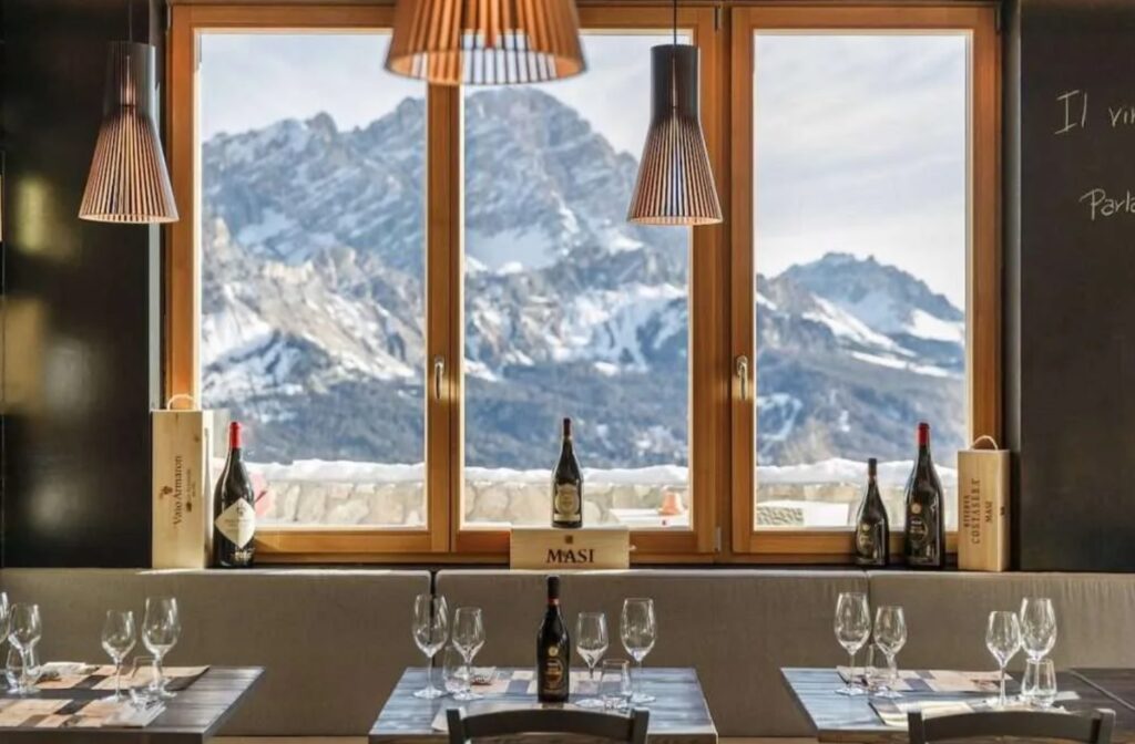 Есть предложения закусок, antipasti, паста, блюда из рыбы, мясо, варианты на гриле. Очень живописный вид на горы Tofane — панорама, которая усиливает впечатление от ужина или вечера. Есть терраса (открытая лаунж-терраса), куда можно выйти, чтобы насладиться видом и расслабляющей атмосферой на свежем воздухе.
